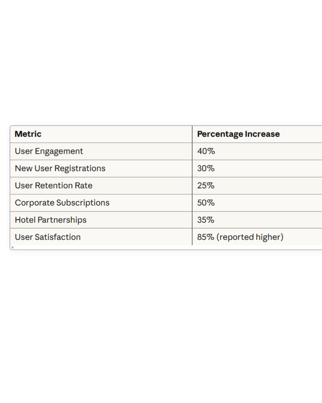 MetricPercentage IncreaseUser Engagement40%New User Registrations30%User Retention Rate25%Corporate Subscriptions50%Hotel Partnerships35%User Satisfaction85% (reported higher)